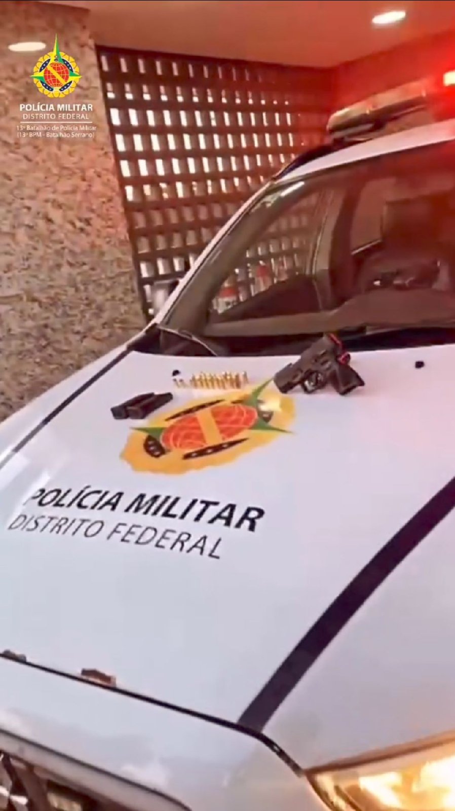A Polícia Militar do Distrito Federal, por meio da RP 33, prefixo 3722, prendeu um indivíduo por porte ilegal de arma de fogo de uso restrito e disparo em via pública.