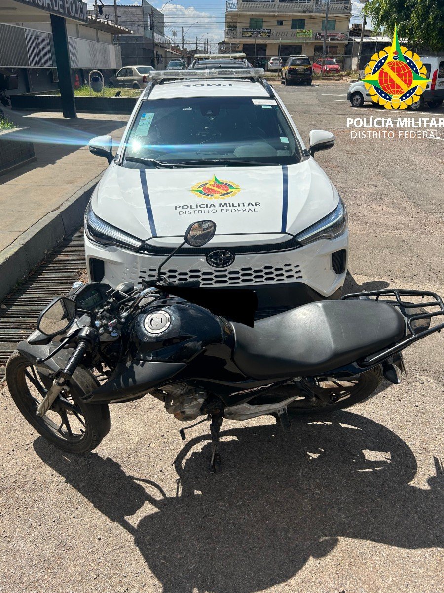 A Polícia Militar do Distrito Federal, por meio do 8º Batalhão de Polícia Militar (8º BPM), equipe de Rádio Patrulhamento (RP 28), no dia 27/09/2025, às 12h, recuperou uma motocicleta produto de furto que já estava com a placa adulterada.