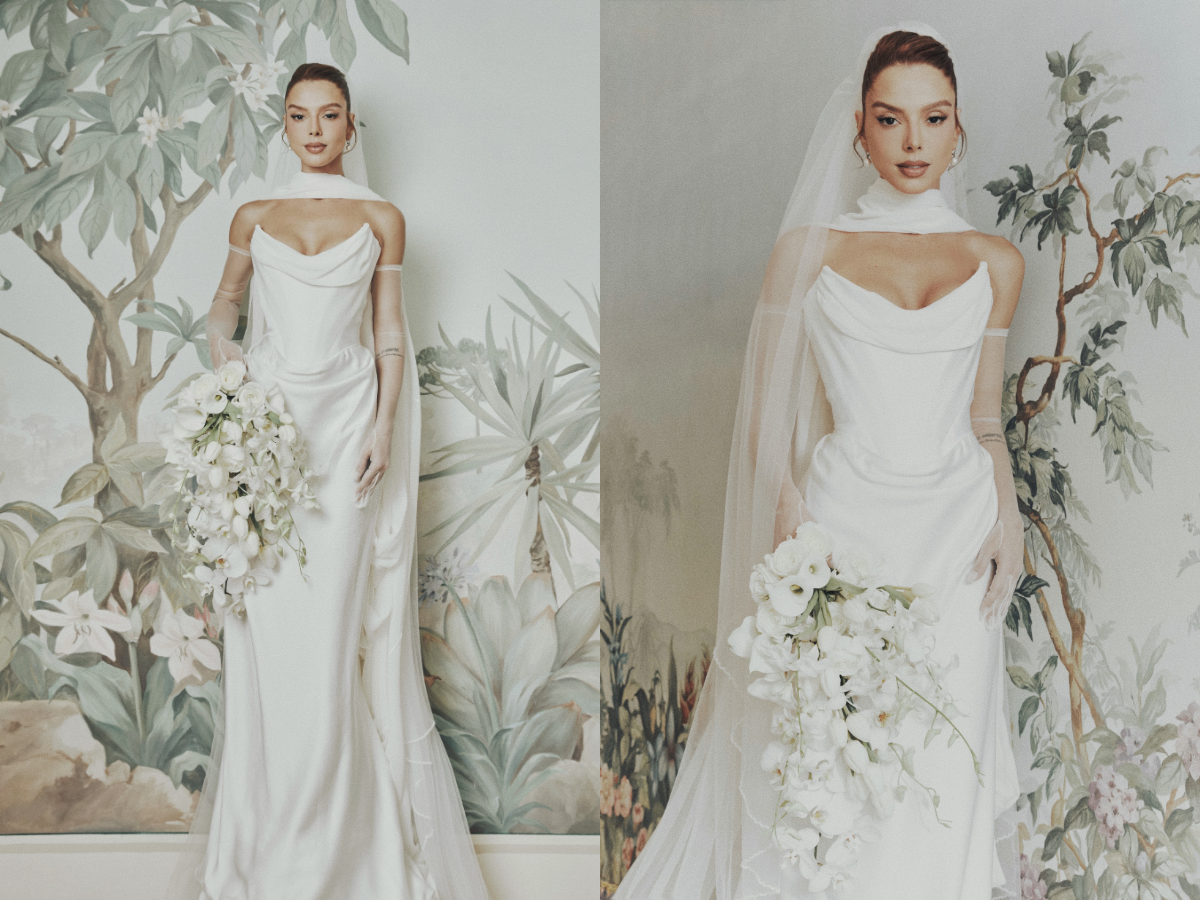 Sobre a peça, a noiva comentou: “Esse foi o vestido que escolhi para esse nosso primeiro momento como noivos. Fui a Paris visitar ateliês e me encantei com o processo criativo dos estilistas que vi de perto. Esse vestido é um modelo clássico, feito de cetim de seda, com uma capa que usamos como lenço — trouxe uma elegância discreta que achei perfeita para esse momento espiritual e tão íntimo”. A estilista, vale destacar, é a mesma dos looks usados pela atriz Isis Valverde no casório com o empresário Marcus Buaiz, em maio deste ano.
