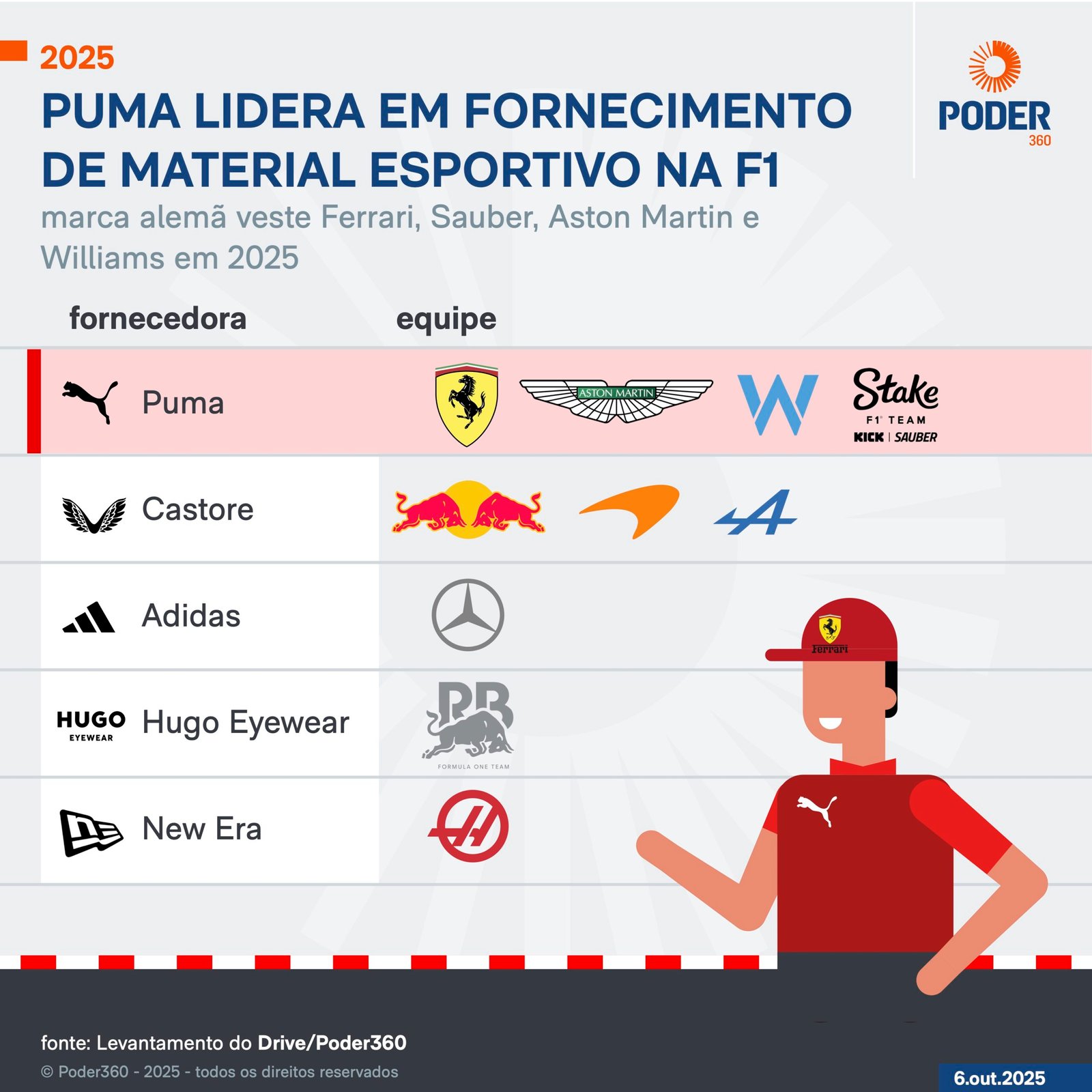 A Puma lidera o mercado de fornecimento de material esportivo na Fórmula 1, vestindo 4 das 10 equipes no grid da temporada 2025: Ferrari, Aston Martin, Williams e Kick Sauber. As informações são de levantamento realizado na última semana pela plataforma alemã Spobis. A fornecedora alemã também é a patrocinadora oficial da F1 (categoria).
