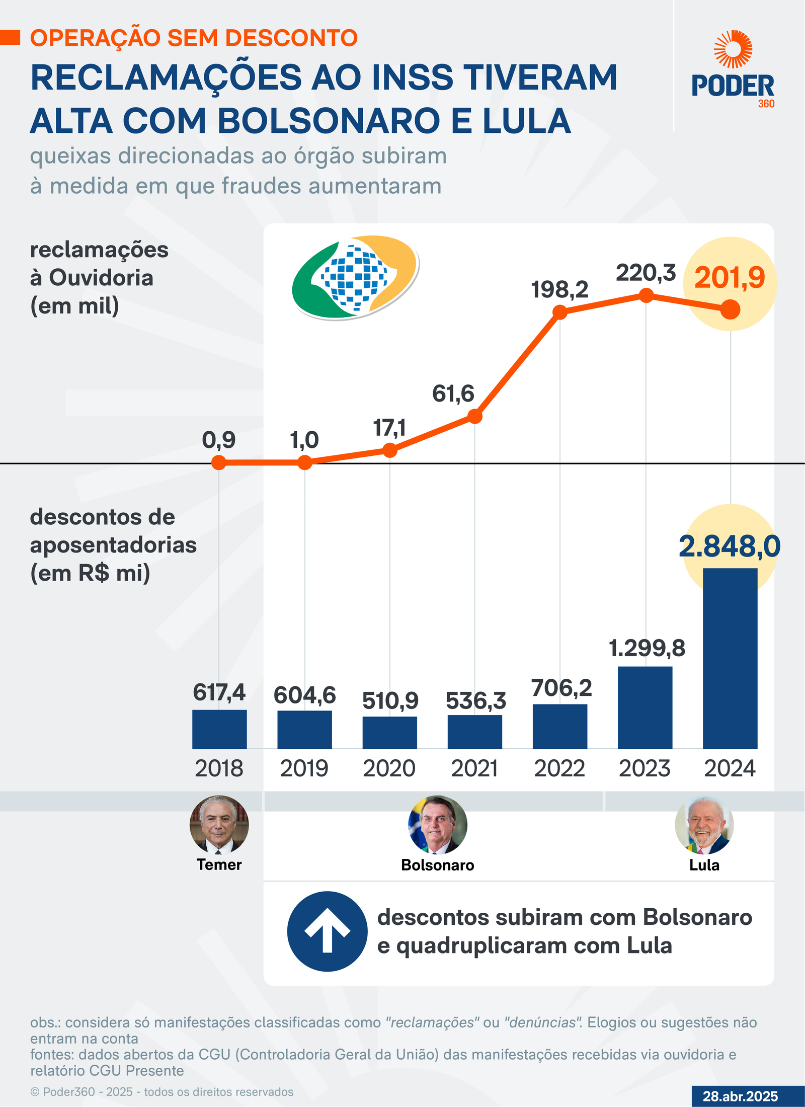 Dados compilados pelo Poder360 mostram que o pico de queixas classificadas como “reclamações” e “denúncias” pelo órgão foi em 2023, no início do governo de Luiz Inácio Lula da Silva (PT). Foram 220,3 mil registros naquele ano, alta de 1.190% na comparação com 2020, quando as fraudes eram menos volumosas.