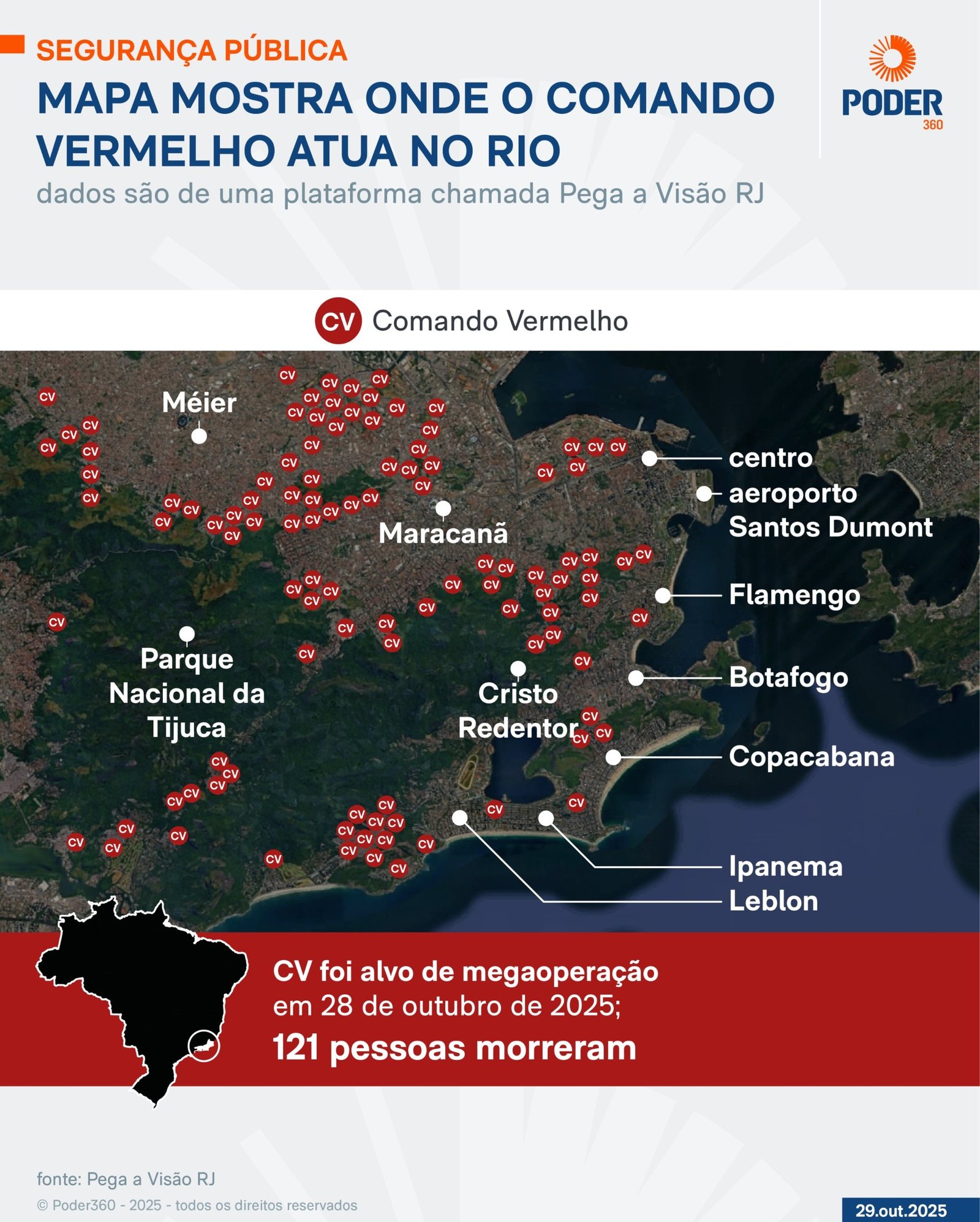 Como o Poder360 mostrou em 29 de outubro, o CV tem expandido seu território no Rio. Segundo o perfil Pega Visão RJ, responsável pela criação do mapa em 2024, as comunidades que foram alvo de ações do CV incluem: