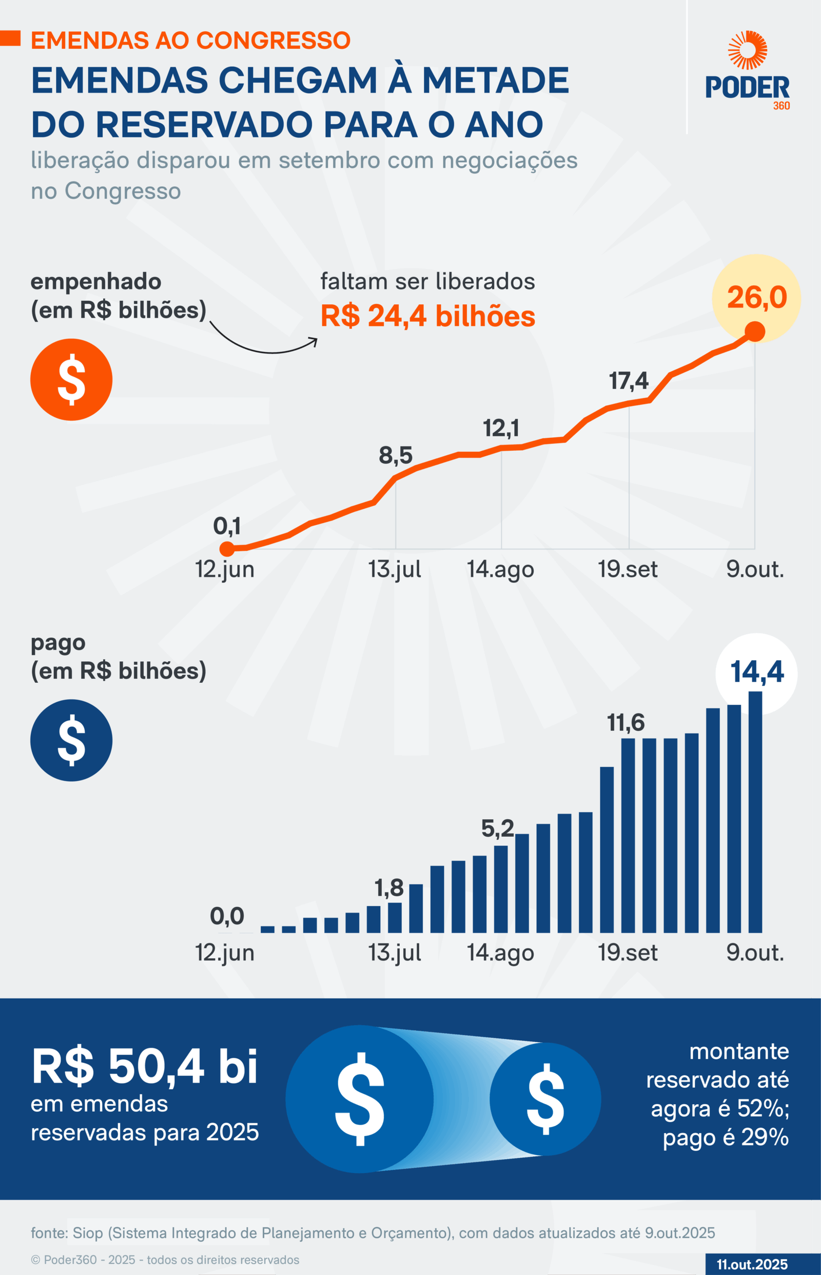 As emendas reservadas a congressistas chegaram na 5ª feira (9.out.2025) à marca de R$ 26 bilhões. O valor representa 52% do total reservado para o ano. O empenho disparou em setembro, durante as negociações para votar na Câmara a isenção do Imposto de Renda para quem ganha até R$ 5.000 e outras pautas prioritárias do governo de Luiz Inácio Lula da Silva (PT).