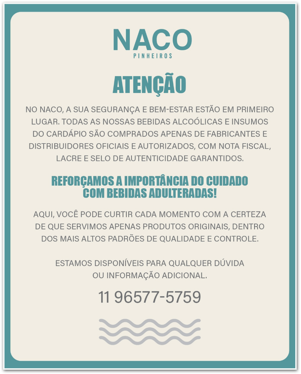 O Naco, em Pinheiros, por exemplo, informou que todas as bebidas e insumos do cardápio “são comprados apenas de fabricantes e distribuidores oficiais e autorizados, com nota fiscal, lacre e selo de autenticidade garantidos”.