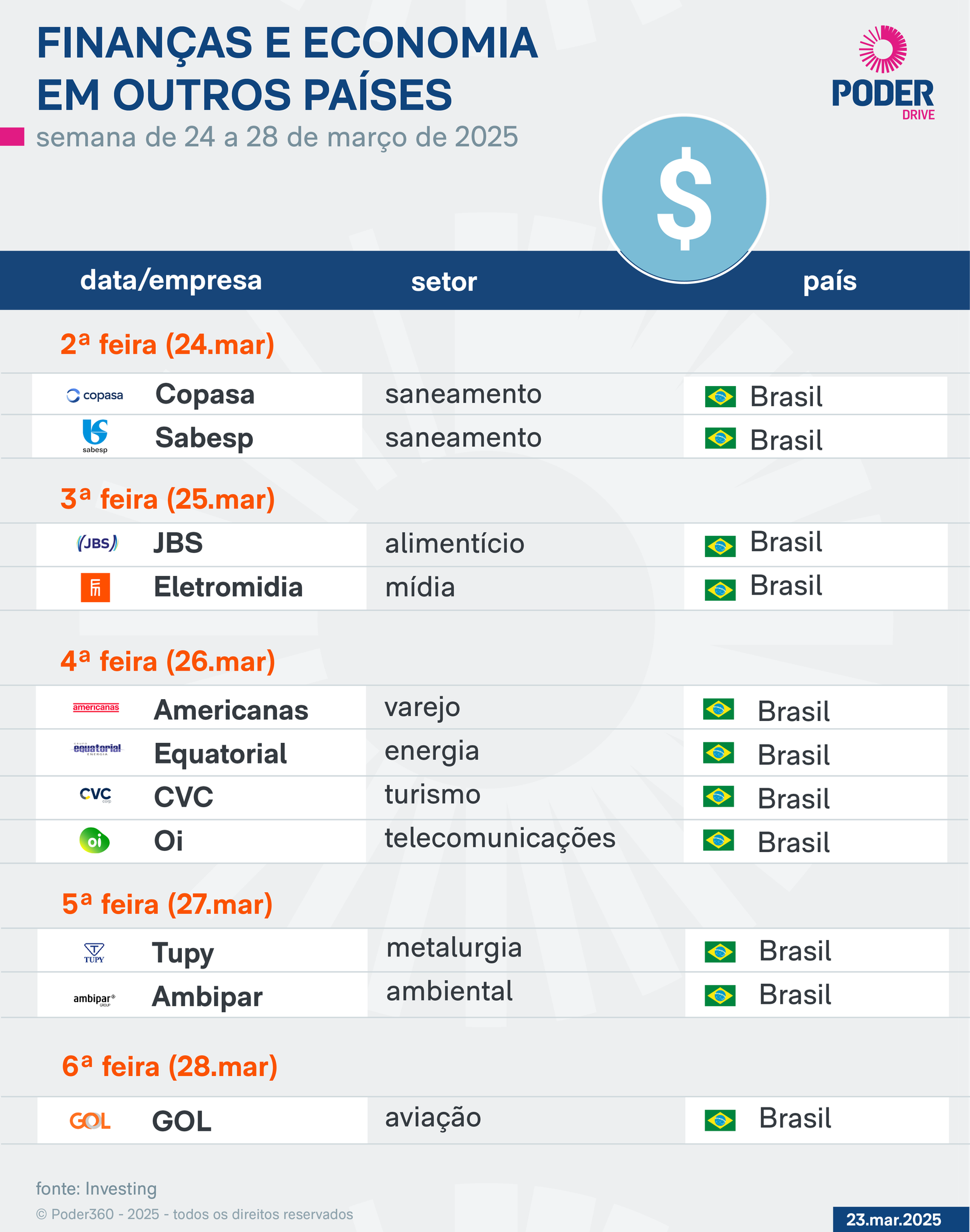 A semana de divulgação de balanços começa nesta 2ª feira (24.mar.2025), com a apresentação dos resultados financeiros das empresas de saneamento Copasa e Sabesp. A GOL publica na 6ª feira (28.mar.2025).