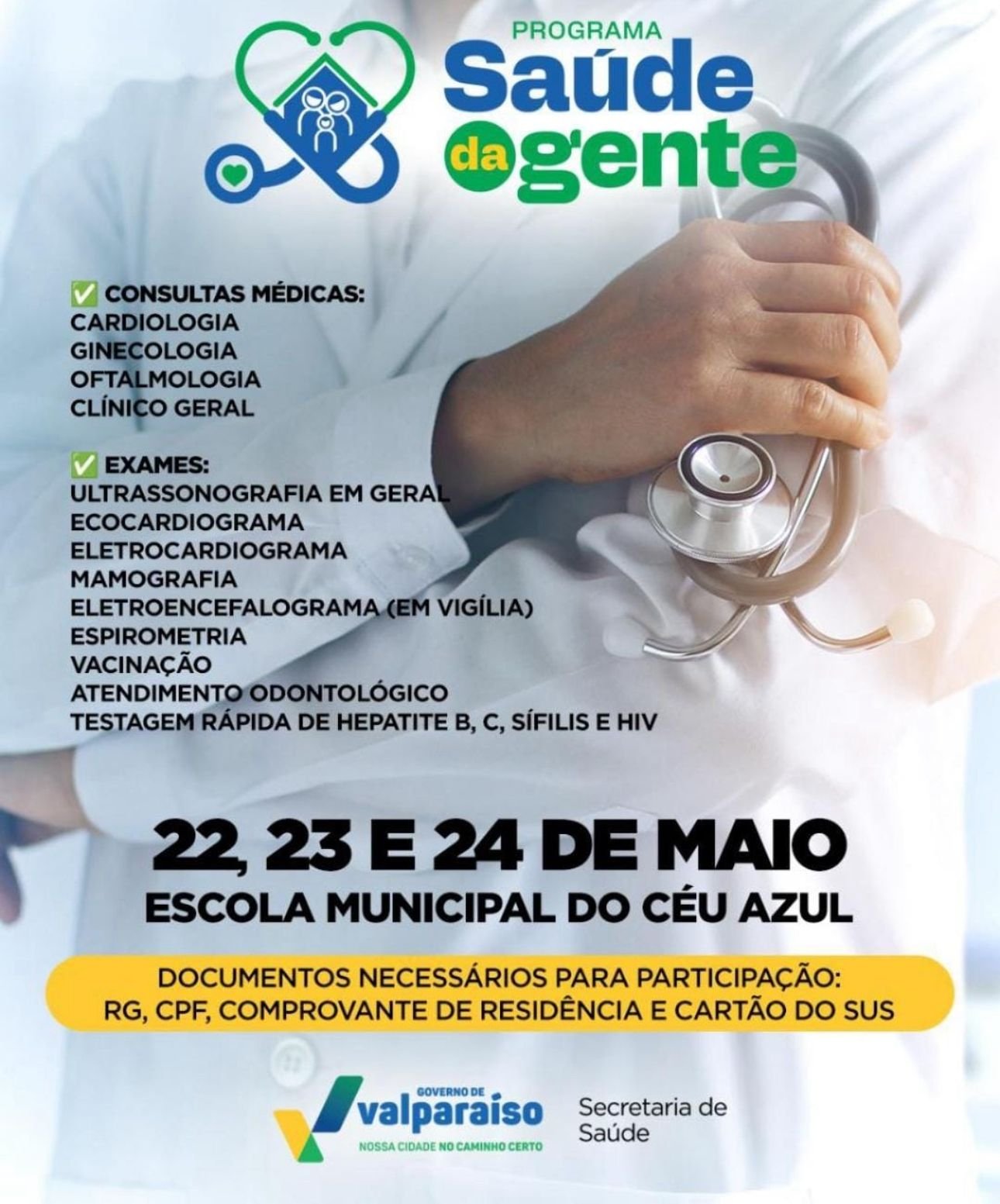 Mais uma edição do Programa Saúde da Gente, acontecerá na próxima semana, nos dias 22, 23 e 24, em Valparaíso de Goiás. O Programa é uma iniciativa itinerante e tem o objetivo de levar serviços de saúde diretamente aos bairros da cidade, promovendo acesso ágil e humanizado à população.