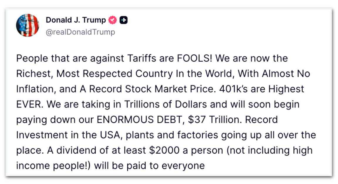 A ideia de repassar parte da receita das tarifas aos cidadãos surgiu nos últimos meses. Na semana passada, Trump escreveu em sua rede Truth Social: “As pessoas que são contra as tarifas são tolas! Um dividendo de pelo menos US$ 2.000 por pessoa (não incluindo pessoas de alta renda!) será pago a todos”.