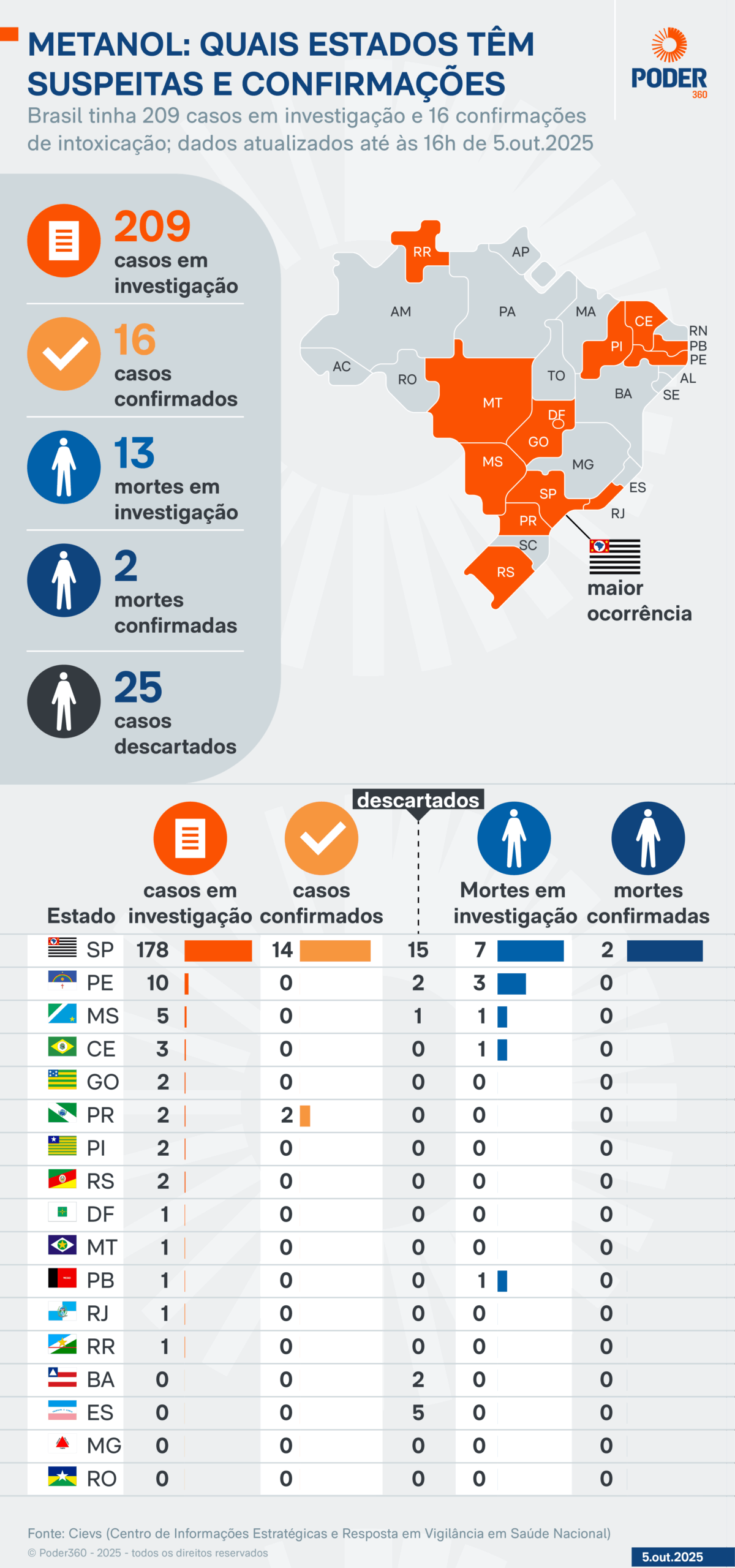 Segundo o Ministério da Saúde, o Brasil tem, no momento, 225 registros de intoxicação por metanol por ingestão de bebida alcoólica, somando 16 casos confirmados e 209 em investigação.