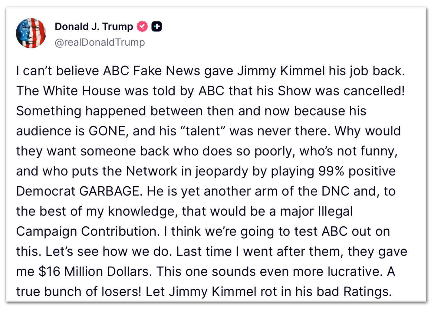 “Não consigo acreditar que a ‘ABC’ Fake News tenha dado o emprego de volta ao Jimmy Kimmel. A Casa Branca foi informada pela ‘ABC’ de que o seu programa havia sido cancelado! Algo aconteceu entre então e agora porque o público dele sumiu, e o seu ‘talento’ nunca existiu. Por que eles quereriam alguém de volta que se sai tão mal, que não é engraçado, e que põe a emissora em risco ao reproduzir 99% de lixo pró-democrata”, escreveu o presidente em plataforma Truth Social.