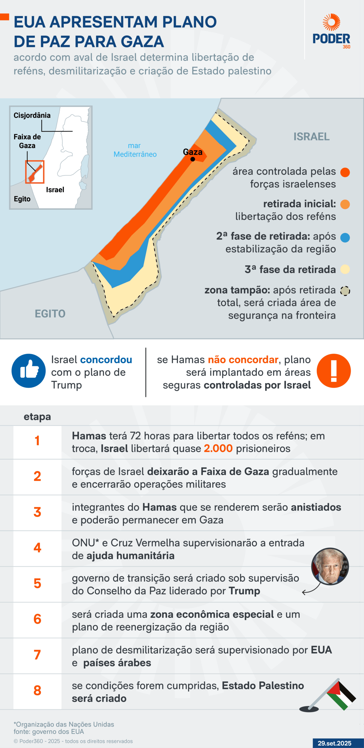 A proposta de paz de Trump apresentada na 2ª feira (29.set) culmina na criação do Estado Palestino, como pretendido pela população local, por nações árabes e por países ocidentais, que deram um passo adiante durante a 80ª Assembleia Geral da ONU (Organização das Nações Unidas) ao anunciarem o reconhecimento do país na região.