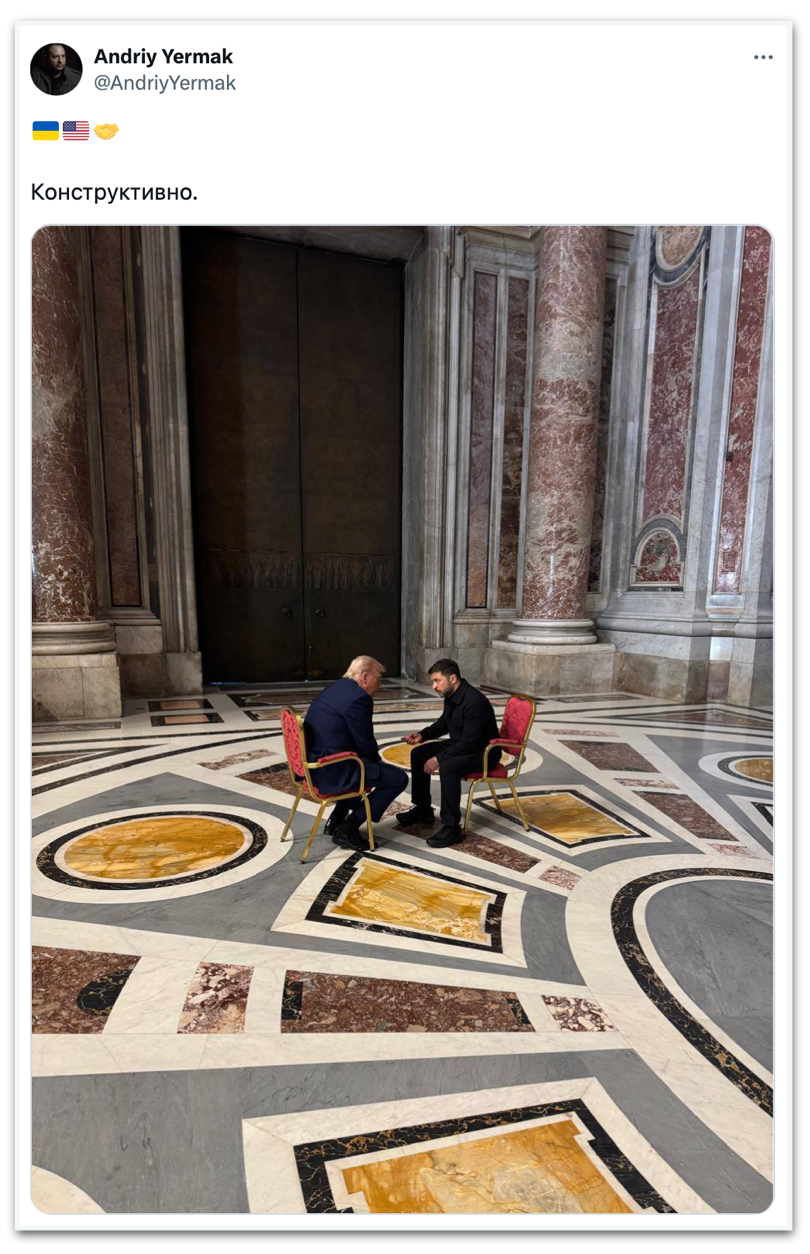 O chefe do gabinete do presidente da Ucrânia, Andriy Yermak, publicou foto do encontro em seu perfil no X. “Foi construtivo”, disse.