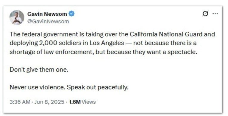 “O governo federal está tomando o controle da Guarda Nacional da Califórnia e enviando 2.000 soldados para Los Angeles — não porque há escassez de forças de segurança, mas porque querem um espetáculo”, declarou Newsom em seu perfil no X (ex-Twitter).