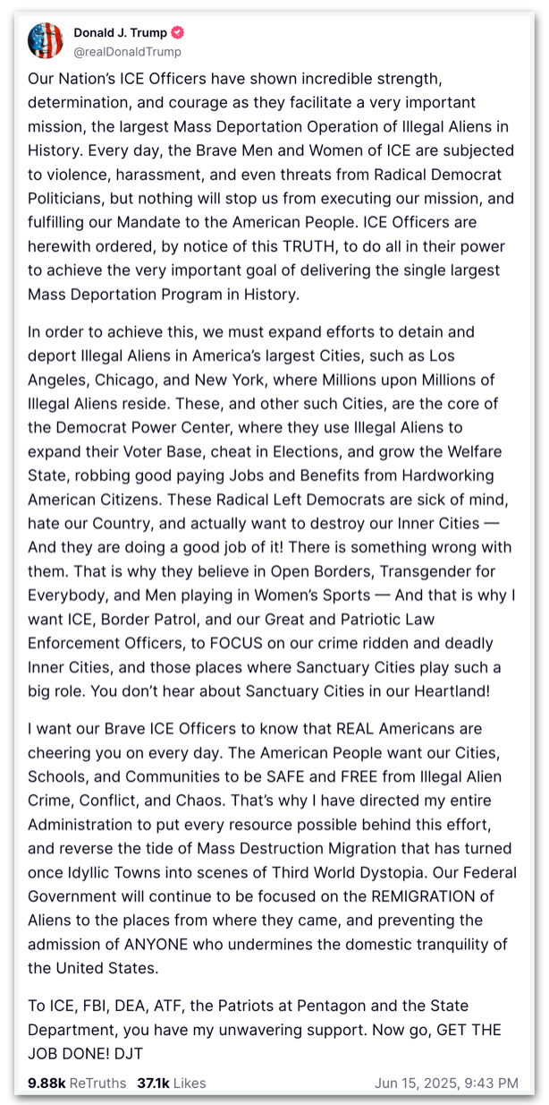 “Para que isso seja realizado, devemos ampliar os esforços para deter e deportar imigrantes ilegais nas maiores cidades dos EUA, como Los Angeles, Chicago e Nova York, onde estão presentes milhões de imigrantes ilegais. Elas — junto com outras cidades assim — representam o coração do poder democrata, onde eles usam imigrantes ilegais para ampliar seu eleitorado, fraudar as eleições e engordar o estado de bem-estar social, enquanto roubam empregos e assistência de cidadãos americanos que trabalham duro. Esses democratas de esquerda estão doentes, odeiam o nosso país e estão, na realidade, tentando destruir nossas comunidades — e estão sendo bem-sucedidos! Algo de errado se passa com eles. É por essa razão que eles acreditam nas fronteiras abertas, em transgêneros para todos [sic], em homens competindo nos esportes femininos — e é exatamente por essa razão que quero que o ICE, a patrulha de fronteira e nossos grandes e patrióticos agentes da lei se concentrem nas comunidades dominadas pelo crime, em lugares em que as “cidades-santuário” [cidades com grandes contingentes de imigrantes em situação irregular] desempenham um papel importante — você não ouve falar de cidades-santuário nas regiões do coração do nosso país!