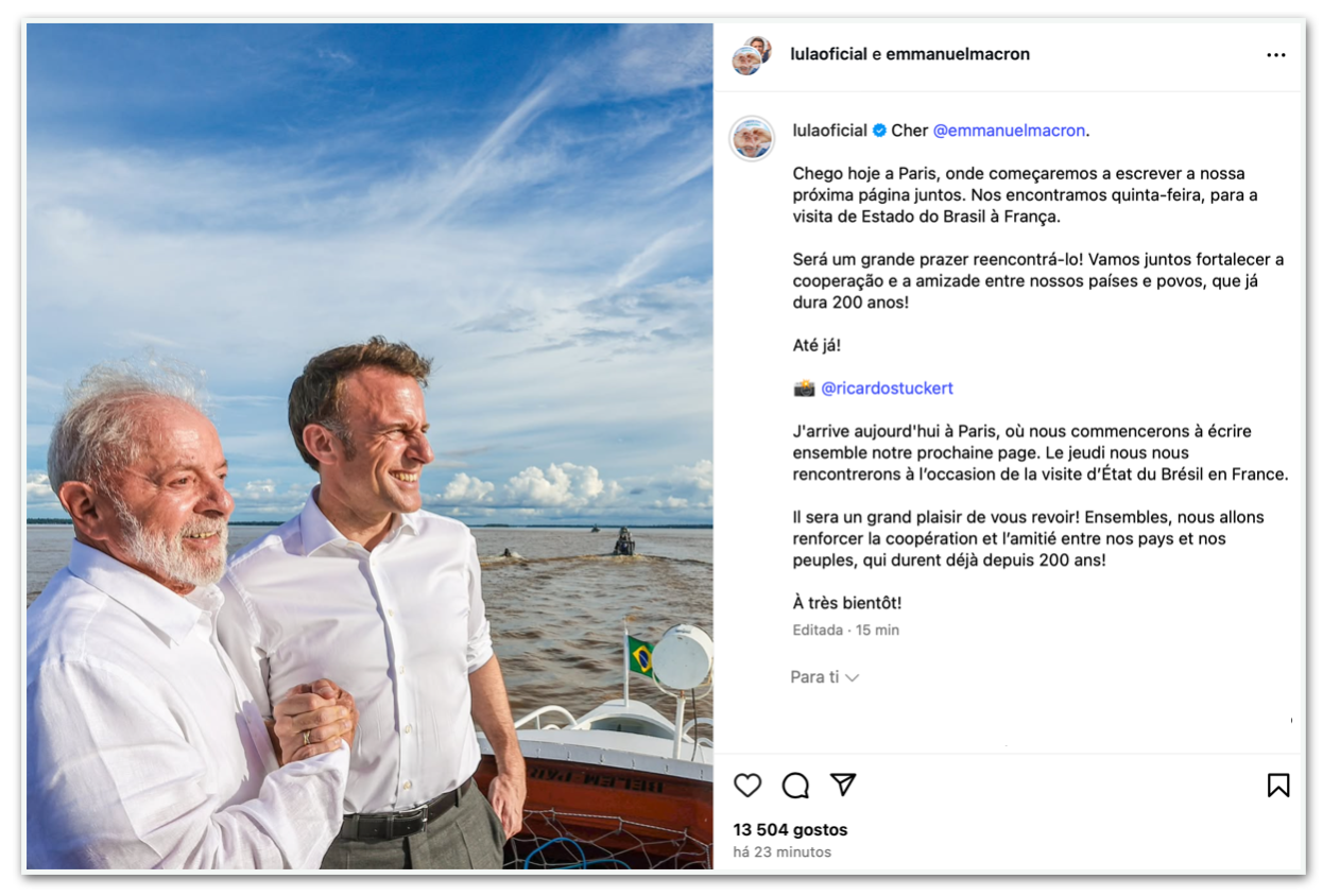 “Cher Emmanuel Macron. Chego hoje a Paris, onde começaremos a escrever a nossa próxima página juntos”, escreveu Lula em seu perfil no Instagram. “Será um grande prazer reencontrá-lo! Vamos juntos fortalecer a cooperação e a amizade entre nossos países e povos, que já dura 200 anos! Até já!”, disse o presidente.