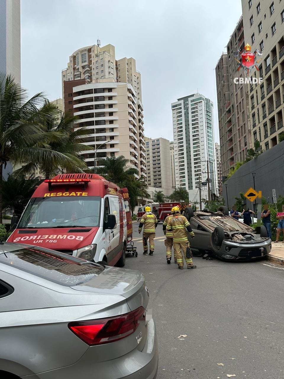 De acordo com o Corpo de Bombeiros Militar do Distrito Federal (CBMDF), o acidente ocorreu por volta das 10h50 e envolveu dois veículos: um Chevrolet Onix cinza, que acabou tombado e ficou apoiado sobre o teto, e um Volkswagen Virtus prata. As equipes atuaram primeiro na segurança da área, estabilizando o carro capotado antes de iniciar o atendimento às ocupantes.