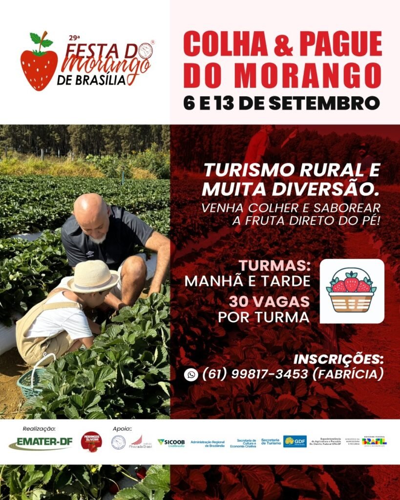 A Emater-DF realiza, nos dias 6 e 13 de setembro, mais uma edição do Colha & Pague do Morango, uma experiência que aproxima o público urbano da vida no campo. Durante a atividade, os visitantes conhecem de perto o cultivo de morangos, têm a oportunidade de colher a fruta diretamente da lavoura.