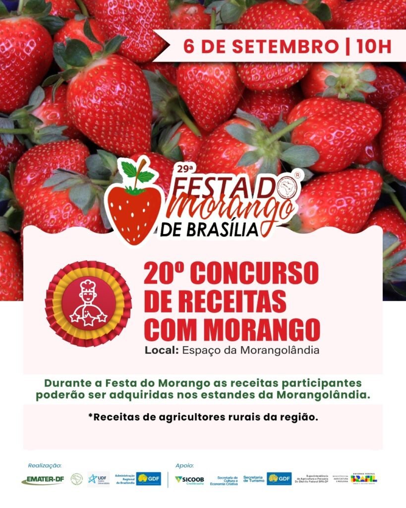 Um dos eventos já tradicionais da Festa do Morango de Brasília é o Concurso de Receitas, que chega à sua 20ª edição. Organizado pela Emater-DF, o certame tem como participantes produtores rurais atendidos pela empresa nas regiões de Ceilândia e Brazlândia. Pratos doces e salgados, desde que tenham o morango como protagonista, são elaborados e avaliados por um júri técnico e popular durante a festa. Neste ano, o evento acontece no sábado (6 de setembro), às 10h, no espaço da Morangolândia.
