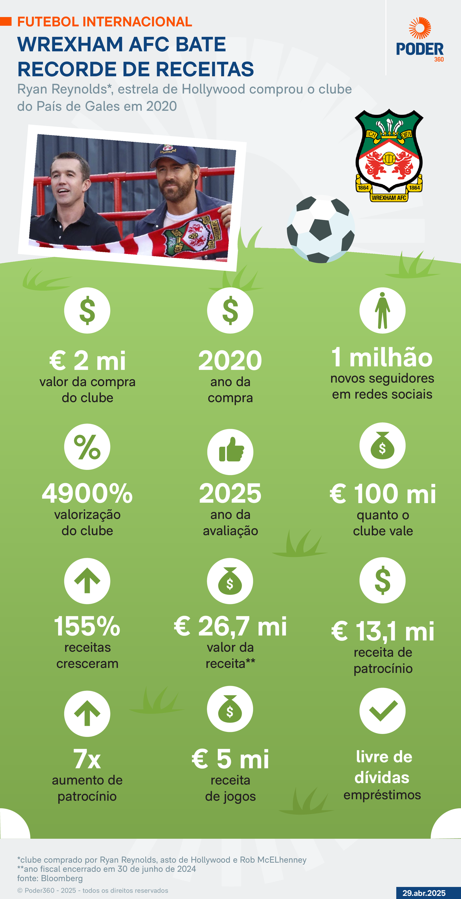 A receita do Wrexham no ciclo 2023-2024 atingiu 26,7 milhões de libras (R$ 189,3 milhões), representando crescimento de 155% em relação ao ano anterior. O valor ultrapassa a média de receita dos clubes da Championship, 2ª divisão inglesa, que é de 22 milhões de libras (R$ 156 milhões).
