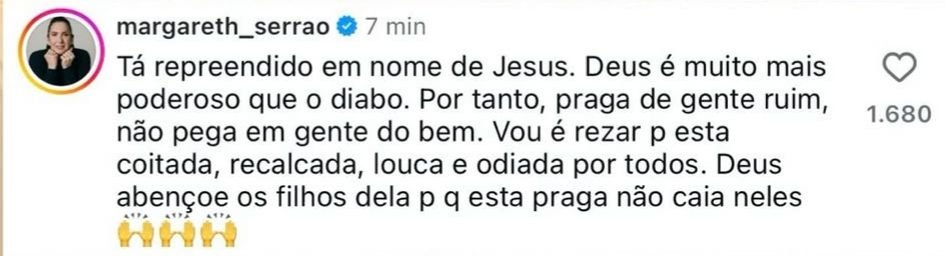 Na postagem, Luana disse: “A maldição vai colar em você, resvalará nos seus filhos, dinheiro de sangue, endemoniado”. Virginia reagiu e prometeu levar o caso à Justiça: “Tá repreendido, em nome do Senhor Jesus Cristo, toda essa maldição que essa mulher joga sobre meus filhos! Agora vamos resolver na Justiça. Falar de mim? Ok. Agora, dos meus filhos? Chega! Cansei!”.